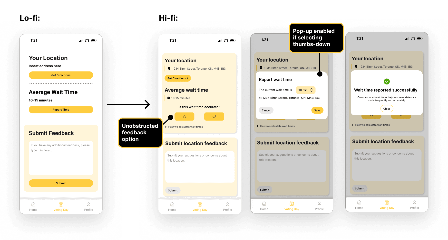 I designed a crowdsourced wait time feature to address the user research finding that electors want to learn of poll station wait times before leaving to vote. This feature provides the dual benefit of engaging electors while relieving polling station staff of this duty, and ultimately reduces traffic to polling stations.