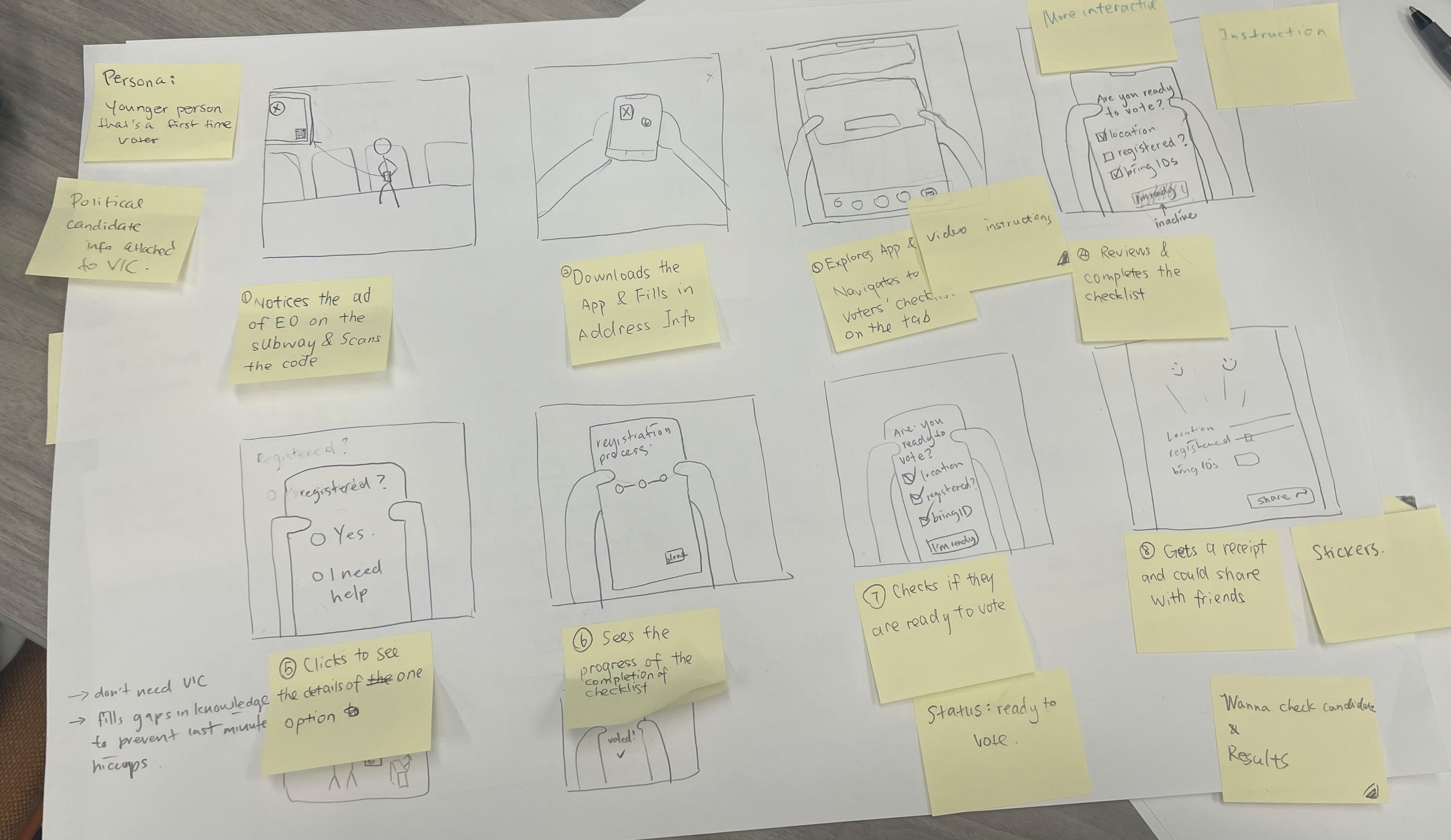 The goal of user research was to identify obstacles to efficiency, security, and accessibility in the voting process. I led the research planning and facilitation, which involved asking users to organize images of touchpoints they'd interact with in the voting process and asking follow-up questions based on their positioning of the touchpoints.