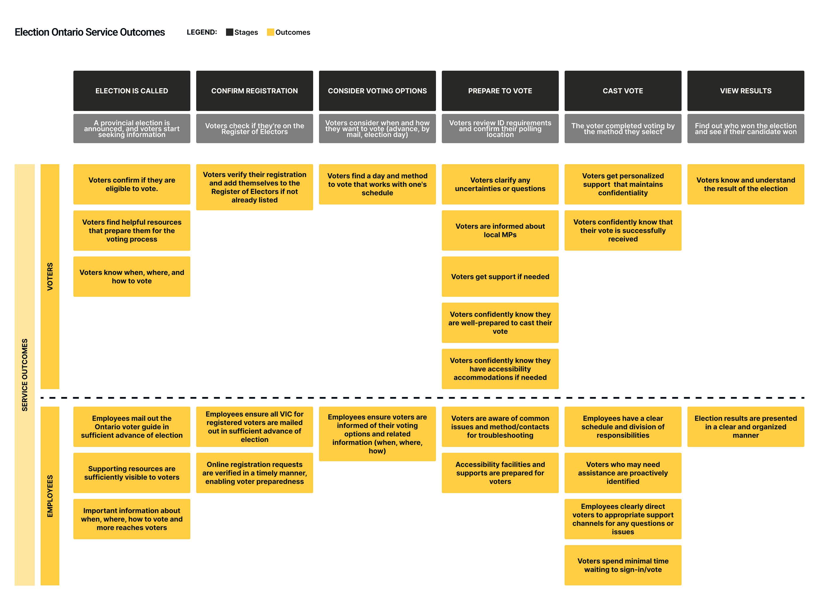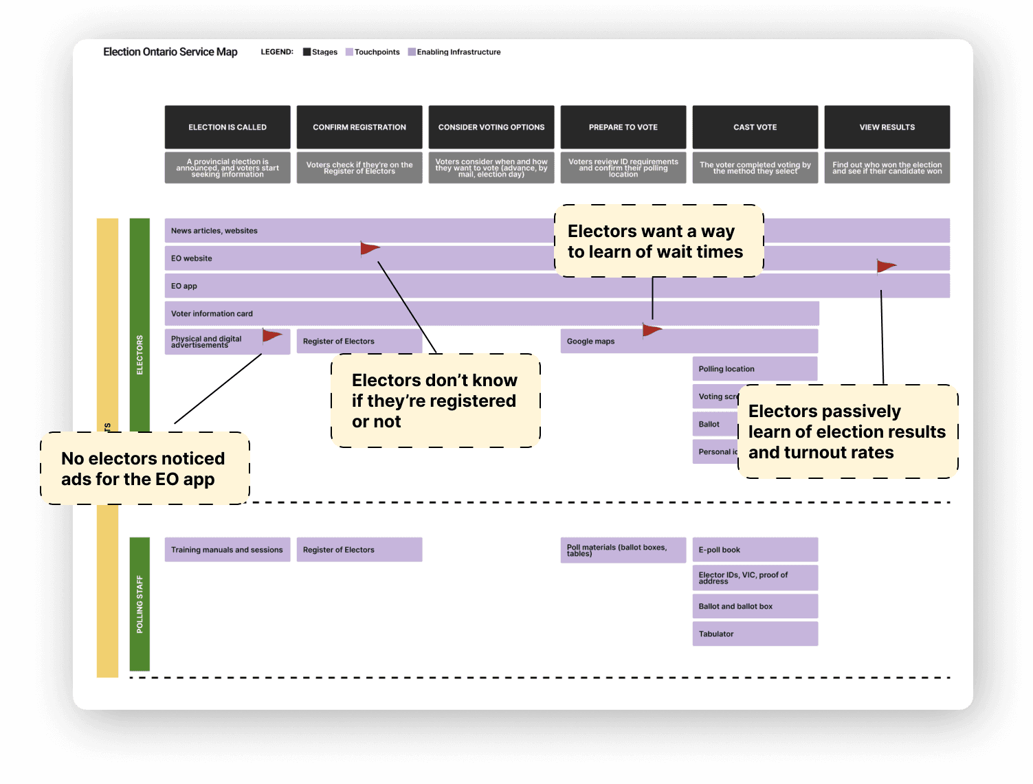 To understand opportunities for service improvement, our team mapped the user journey, service touchpoints, and supporting infrastructure in a service blueprint, and conducted user research to identify what an ideal voting experience could look like for both electors and polling staff.